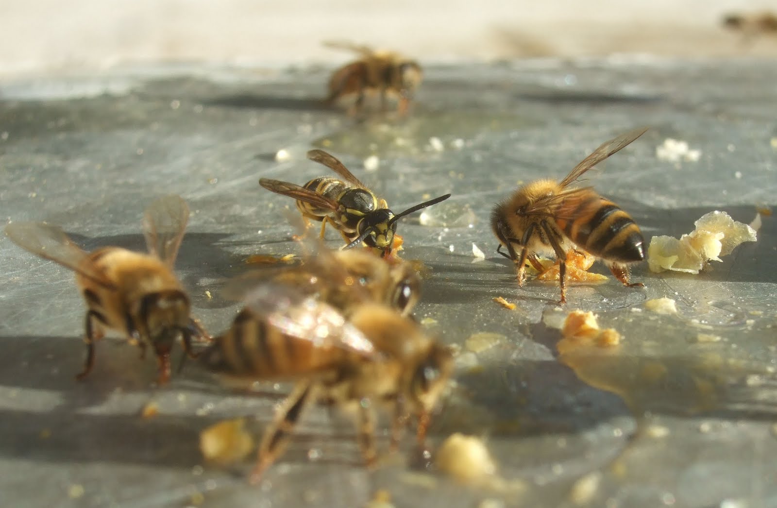 [The yellow jacket wasp is pictured in the center along with several honey bees. The yellow jacket is hair-less and coloured yellow and black. Their size is similar to a honey bees. They are omnivores and are much more aggressive than bees].